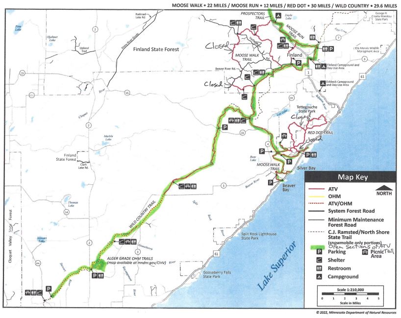 Great news…..we have opened the Red Dot corridor trail from Silver Bay to the Wild Country Trail (State Trail). You can also ride the Moose Walk trail from the Wild Country Trail to Finland on the southern route. Most of the Moose Walk Trail remains closed however. The trail to Beaver Bay is also open. George’s Gorge, Blue Jay Vista and the Palisade trail towards Tettegouche remain closed. Please be aware that work is being done on all the trails and watch for operating equipment even on the open trails as they will be used to access other trails that are not open. The map below shows the trails that are usable. Please ride safe and thanks for you patience as we repair more of our trails.